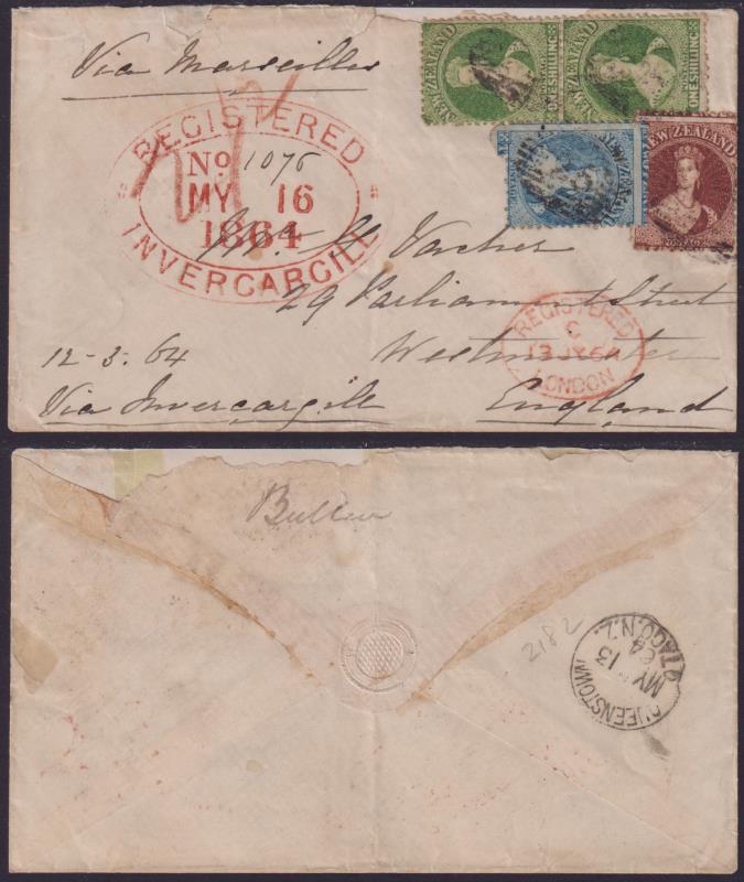 1864 registered cover "Via Invercargill", to England with FFQs 2d, 6d, vertical 1/- pair p13 (SG 73, 77, 80). Oval