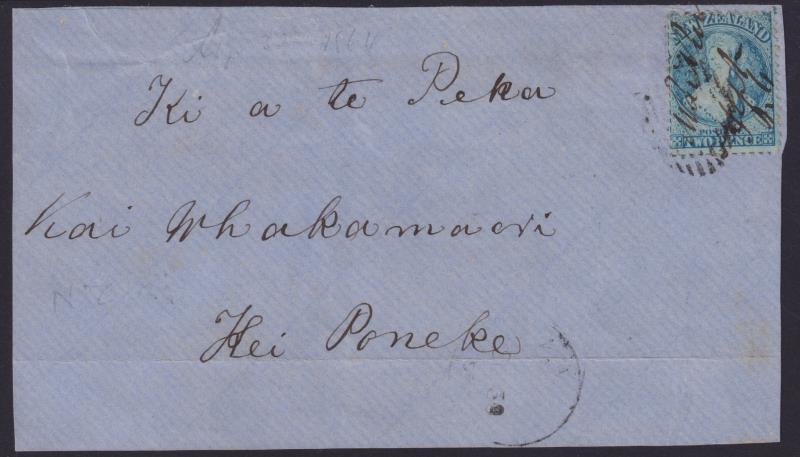 1864 front, addressed in Maori to "Kei Poneke" (Wellington). 2d FFQ tied by m/s Wainui cancel "SEPT 64" & illegible barred