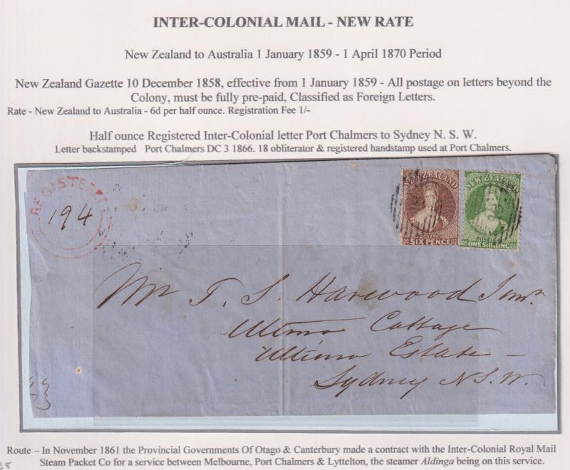 1866 Port Chalmers to Sydney cover with 6d brown, 1/- green. B/s Port Chalmers DC 3 1866, cancelled "18" & red "REGISTERED"