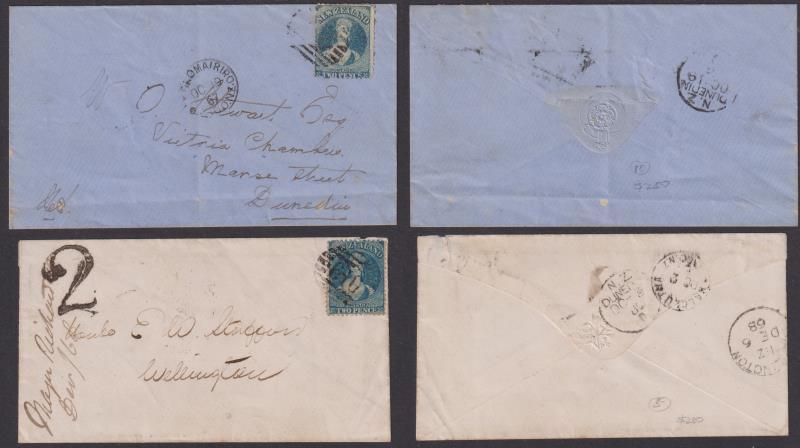 1867-68 Otago covers (2) (fine) franked 2d blue FFQ, p12½: a) canc unclear barred obliterator (O14), with at left VG