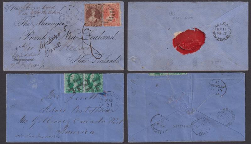 1867 & 1873 West Coast covers (2): a) printed cover ex Westport to Bank of NZ, Nelson, with very unusual 7d franking (FFQ 6d &