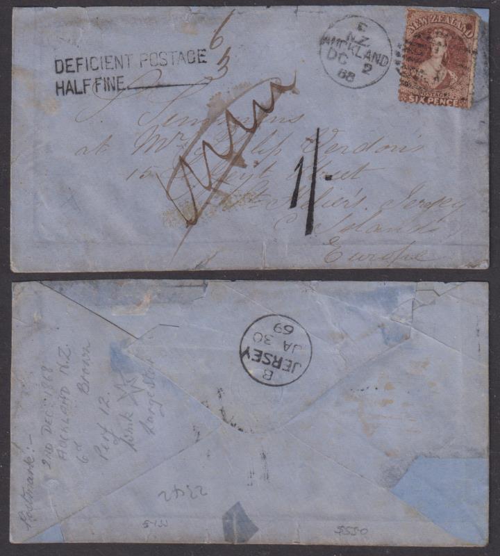 1868 cover franked FFQ 6d red-brown, p12½, Auckland (good duplex d/s DC 2 68) to Jersey, GB, with at left fine h/s "DEFICIENT