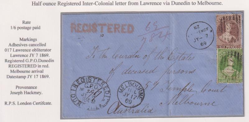 1869 envelope registered from Lawrence to Melbourne, bearing 6d brown & 1/- yellow-green (both with small deflect), cancelled