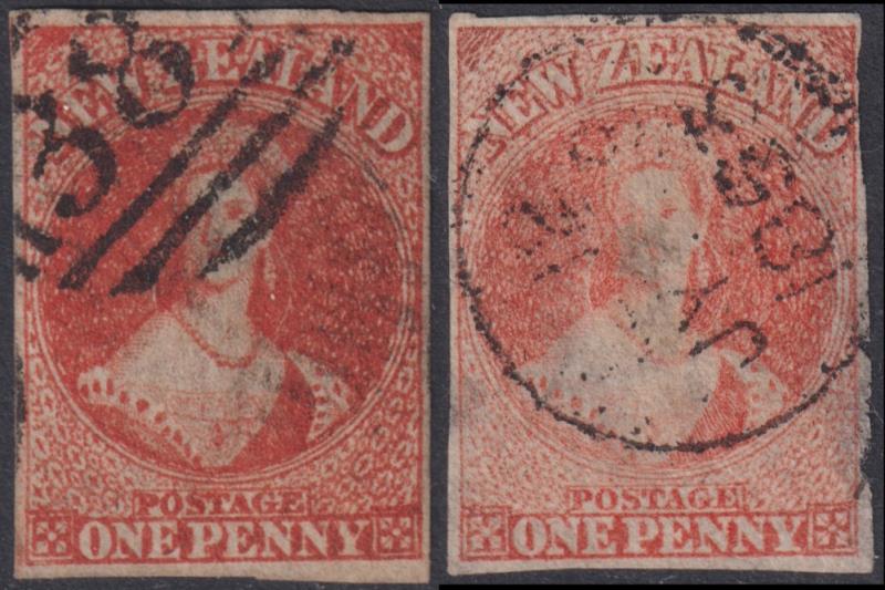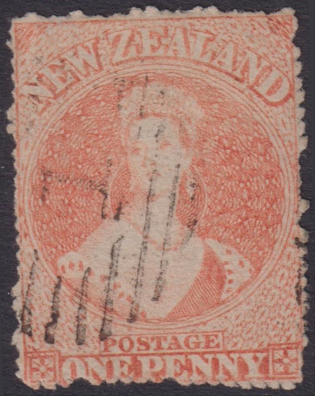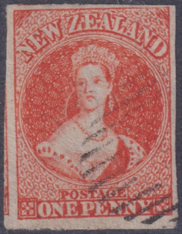 1d carmine-vermilion, imperf 4 margins (good to large), star wmk, FU. Originally cancelled by very light, illegible NZ barred