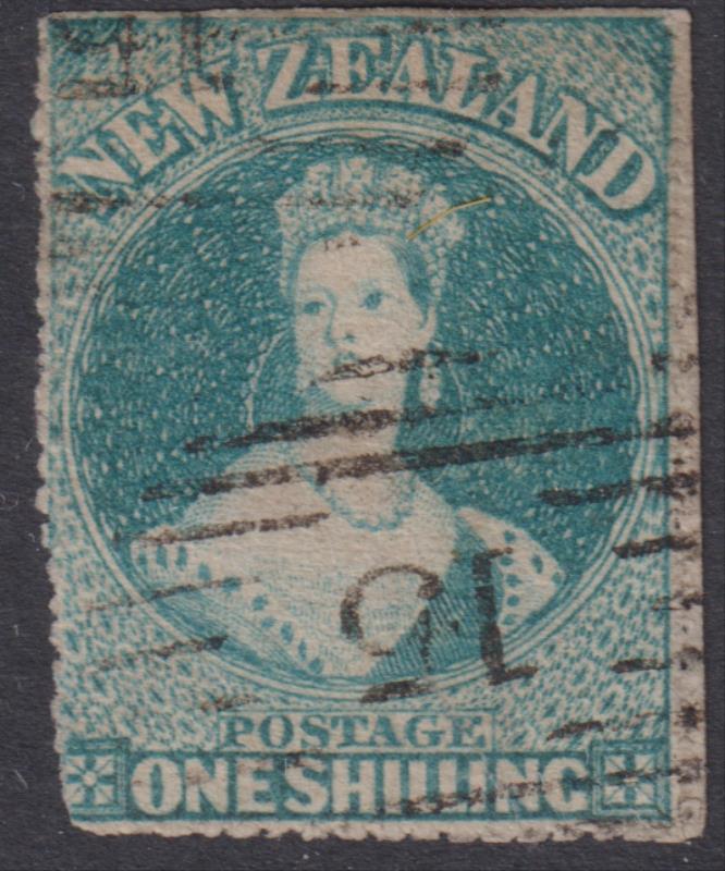 1/- blue-green, serrated p16-18 (at Nelson) clearly on 3 sides incl internal row at right, clear barred "15" cancel (Nelson).