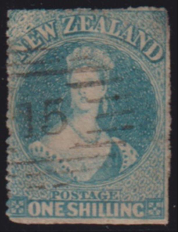 1/- blue-green, serrated perf about 18 (at Nelson), barred "15" pmk. Serrates on 3 sides mostly genuine but top left of stamp
