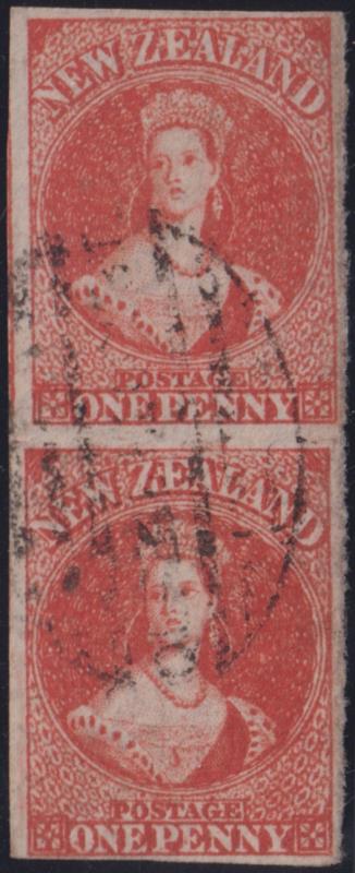 1d carmine-vermilion imperf vertical pair, full margins, star wmk, indistinct Queens Redoubt pmk. SG 35. Cat £800. FU. (Image)