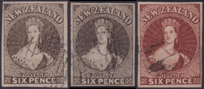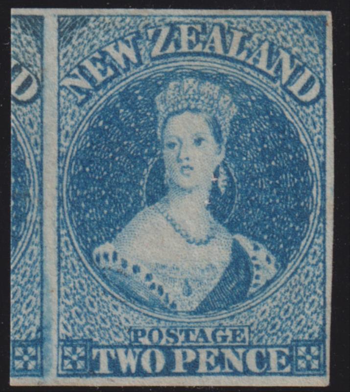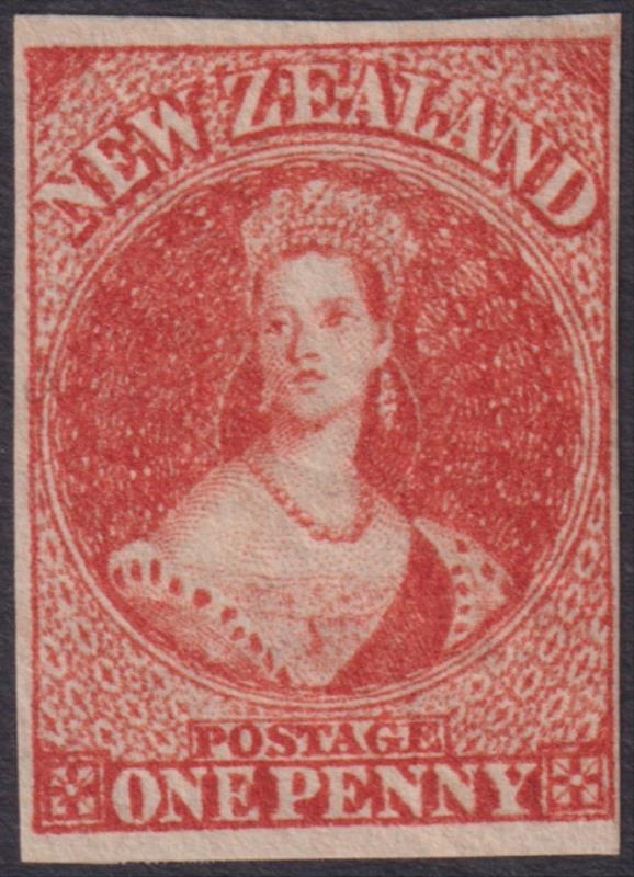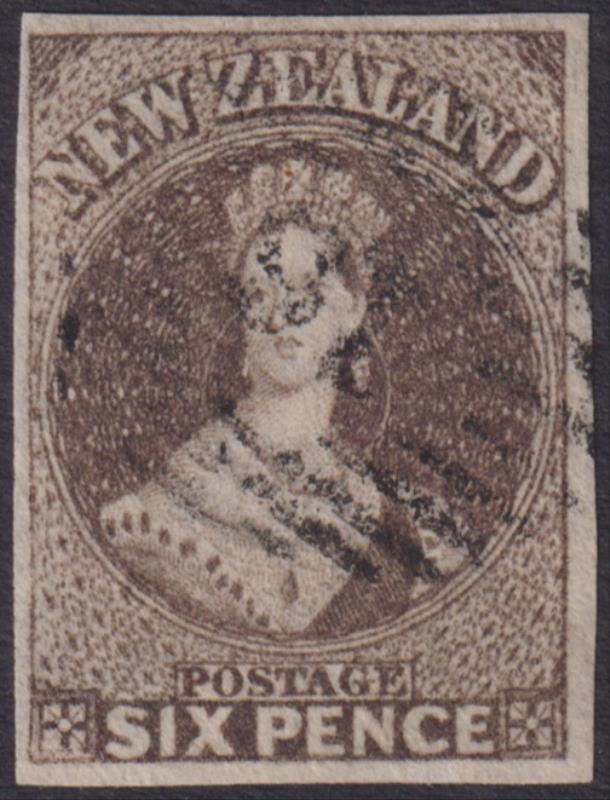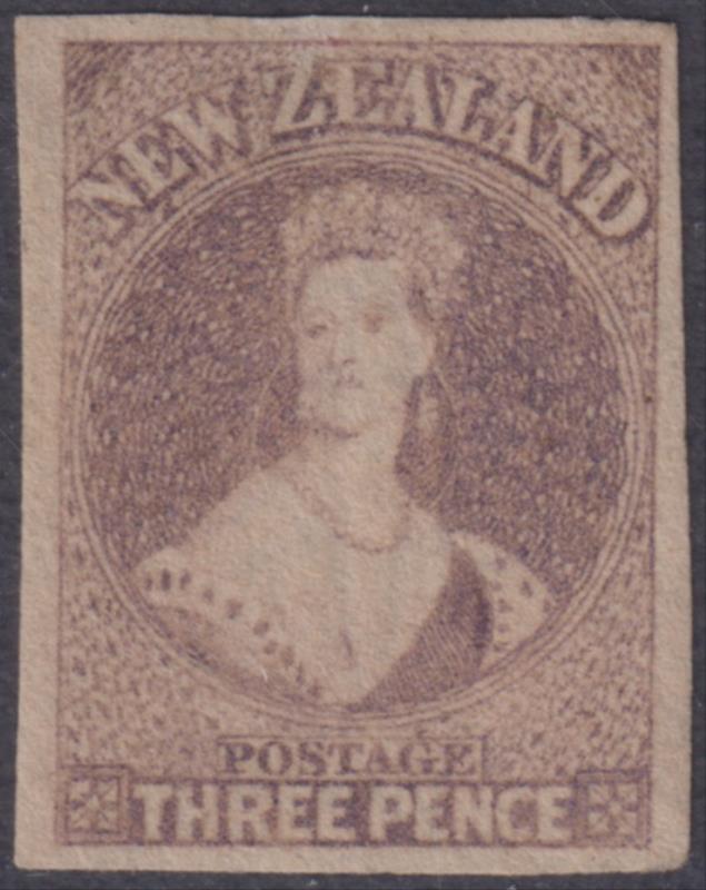 3d brown-lilac, imperf 4 good to big margins, star wmk, paper inclusion at right end of necklace. RPSNZ cert (2022). SG 40.