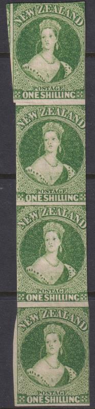 1/- green imperf vertical strip of 4, cut into both sides & partial separation cut top 2 stamps. Remarkable multiple. Ex