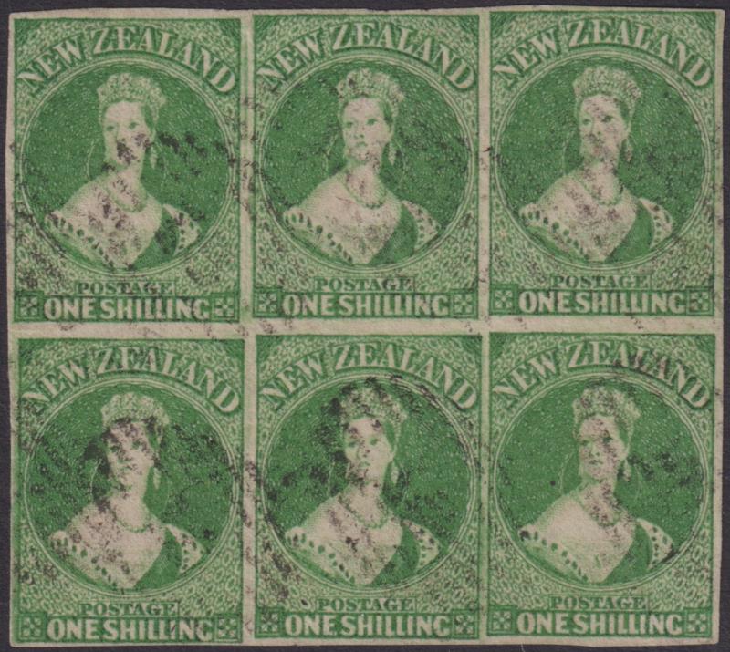 1/- yellow-green imperf horiz block of 6, full margins, star wmk. Attractive rare multiple. SG 45. Cat £3000+. FU. (Image)