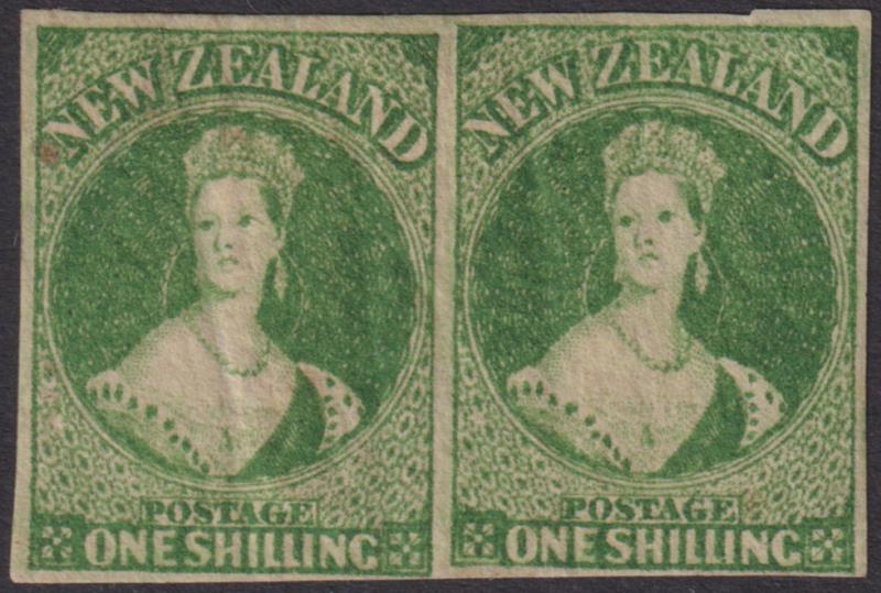 1/- yellow-green horiz pair, imperf full margins, close lower right, OG gum mint faults & small stain on front. PF New York