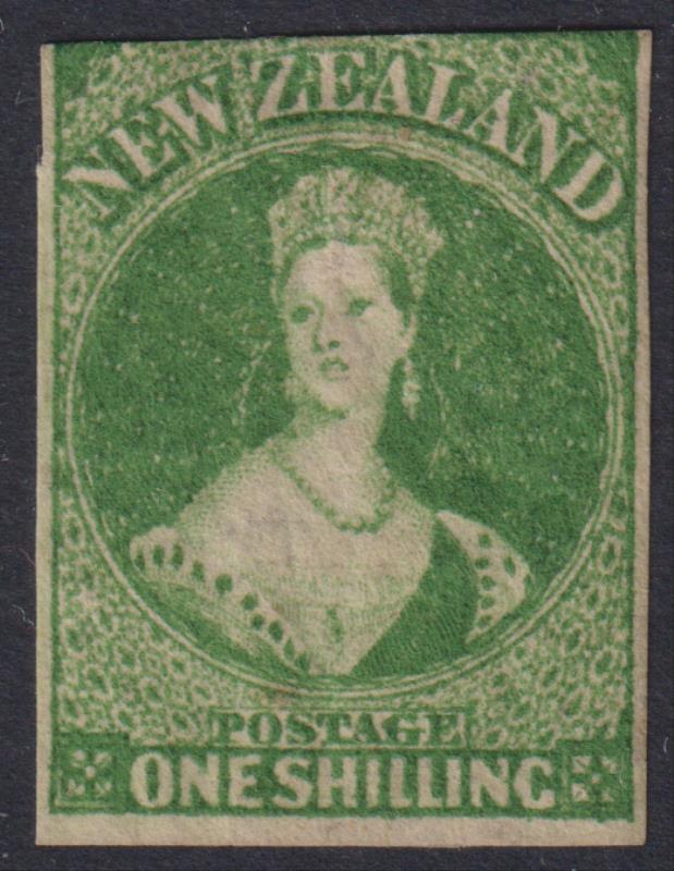 1/- yellow-green, imperf 3 margins, star wmk. SG 45. Cat £3500. OG mint. (Image)