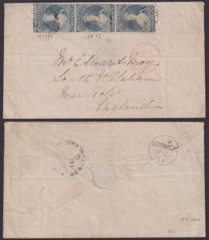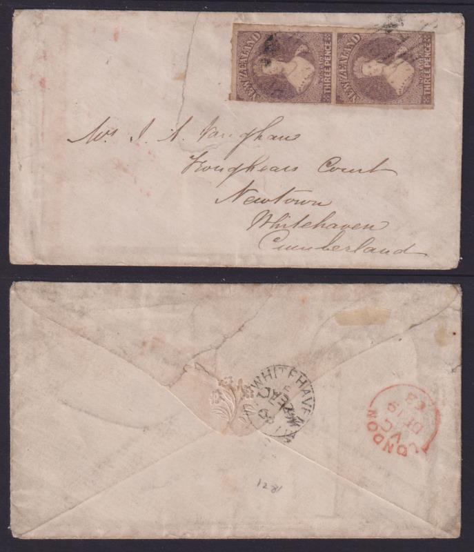 3d brown-lilac vertical pair, rouletted 7, tied to 1863 cover to UK, with Auckland "1" obliterator cover has tear from the flap