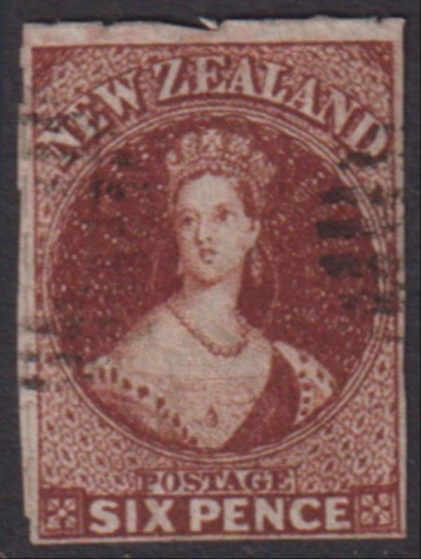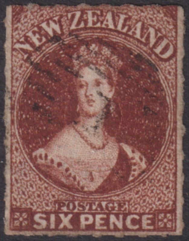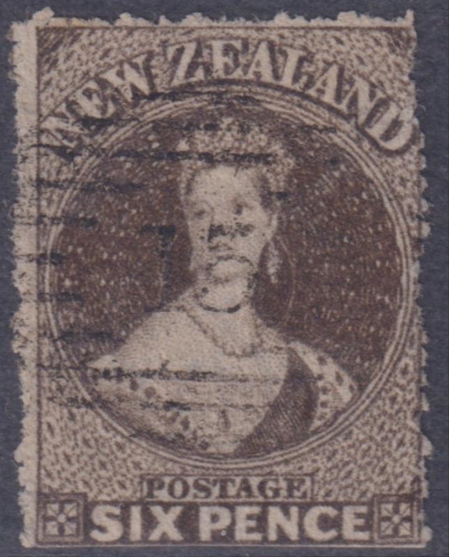 6d black-brown, serrated p16 (at Nelson) on 3 sides, barred "15" cancel (Nelson), star wmk. Ex Beaumont, Dumas. RPSL cert