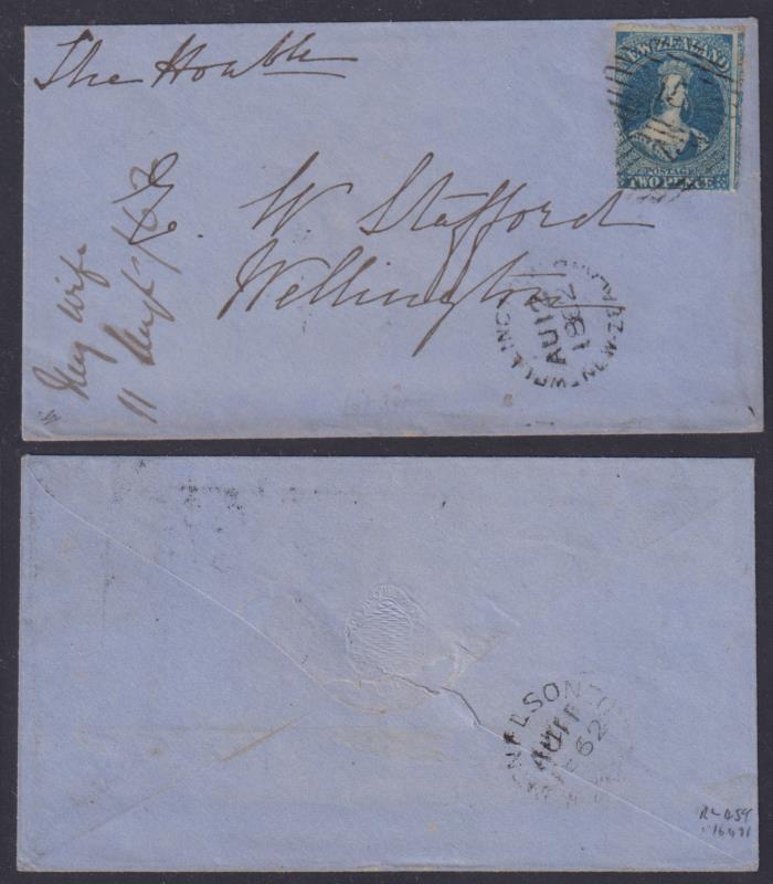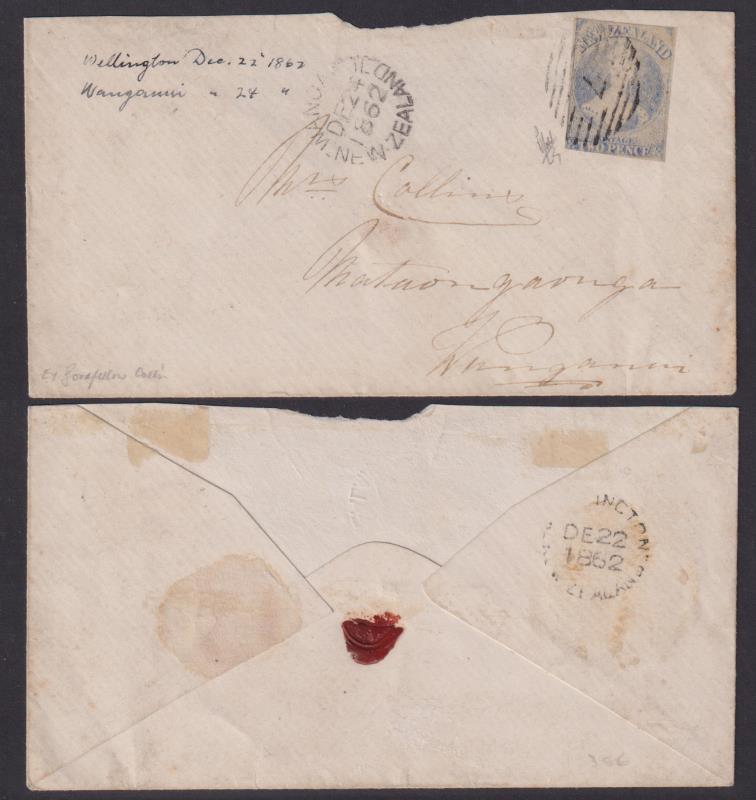 1862 cover Wellington to Wanganui, with 2d pale ultramarine imperf Pelure (SG 83), barred "7" cancel. Margins touched to