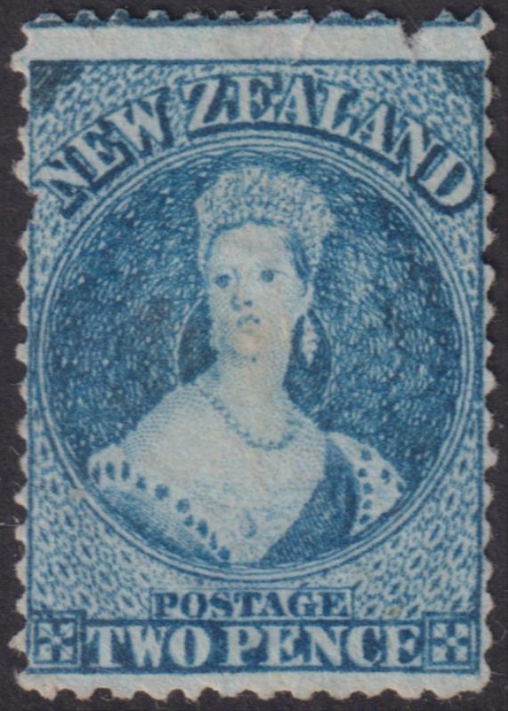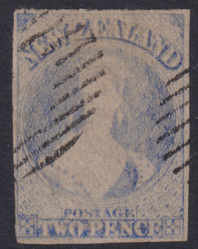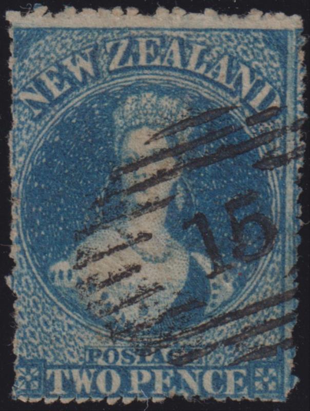2d deep blue, Y roulette 18 at Nelson, star wmk, fine barred "15" cancel (Nelson). Tiny thin spot below W of "NEW". Stamp