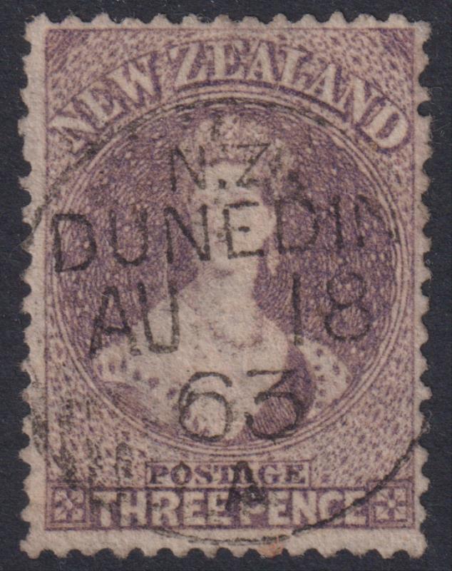 3d brown-lilac, p13, star wmk, superb Dunedin AU 18 63 cds. Ex Gahagan. SG 74. Cat £600. FU. (Image)