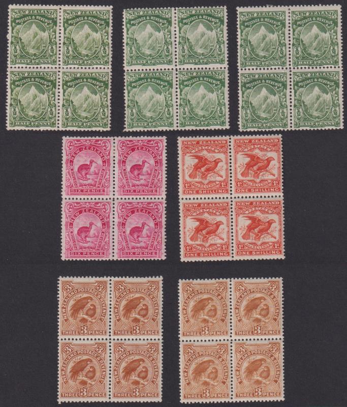 1902 6d Kiwi, Cowan, p11, watermarked paper: a study of shades, varieties & errors as singles, multiples & blocks of 4,