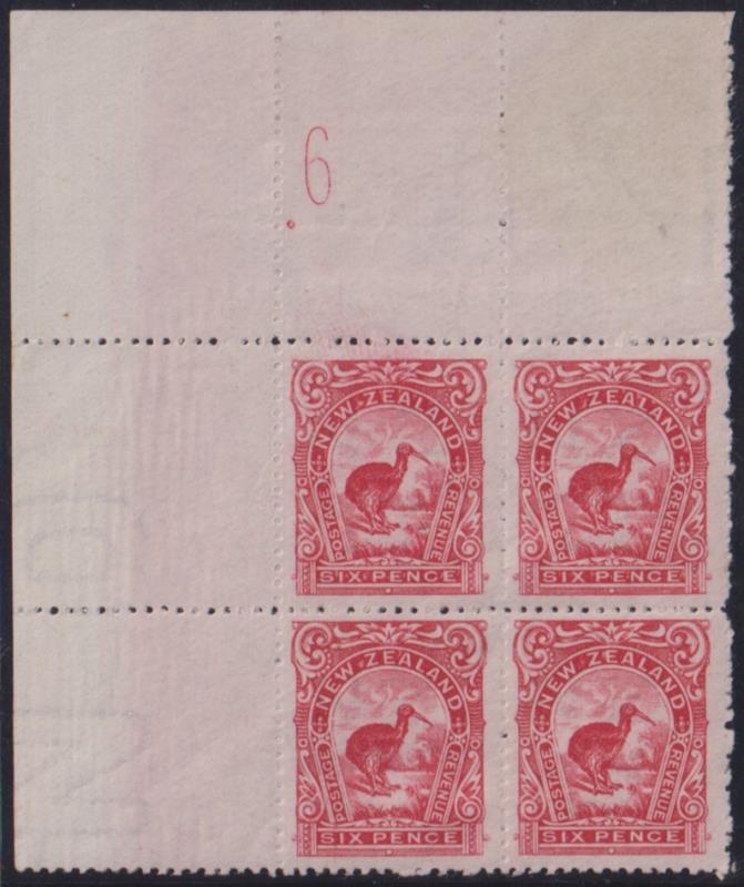 1907 6d Kiwi reduced corner block of 4, p14, plate 6. CP E15a. Cat $5000. MUH. (Image)