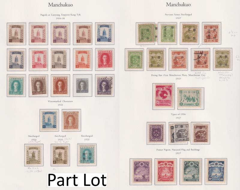46 / imageChina-Manchukuo 1932-45 comprehensive colln of mainly mint on 11 hingeless album pages. Noted 1935 3f on 4f White Pagoda with no wmk mint; 1936 Pictorials set of 22 (excl 38f) mixed mint & used; & 1937 13f on 12f chestnut Changpai Mountain with wide spa (Image)
