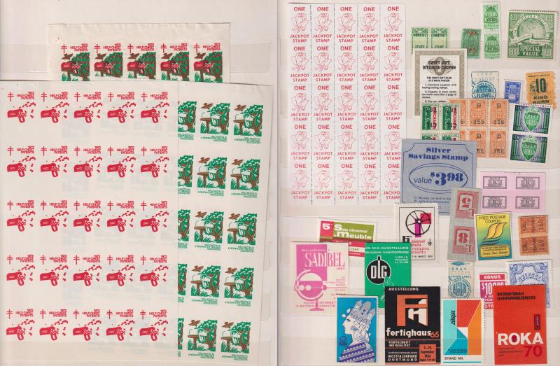 48 / imageCinderellas c1930-2000 colourful world colln of Christmas seals, Tb stickers, savings stamps, & incl 5 diff NZ 1972 Tb colour separation sheets of 25, GB 1971 Post Office strike mail etc, in s/b. (Image)