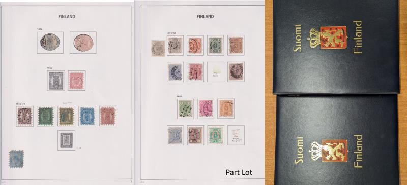 55 / imageFinland 1856-2002 comprehensive mostly used (m/s mostly MUH) colln in 2 Davo albums with slipcases. Noted 1856 5k & 10k both with penmark & pmk (faults), 1866 5p & 8p GU/FU, 1885 5m green & rose FU, 1901 10m grey & black FU, 1927 25m orange & vermilion G (Image)