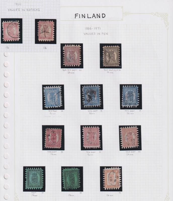 56 / imageFinland 1860-c1975 mostly used colln on 20 pages (299v) & in a Swedish made album (674v + 1 cover), commencing with 2 pages of serpentine roulettes (13v - cat £4000+): 10k x 2; 5p, 8p x 2, 10p, 20p x 3, 40p x 3, & 1mk - these with mostly intact roulette p (Image)