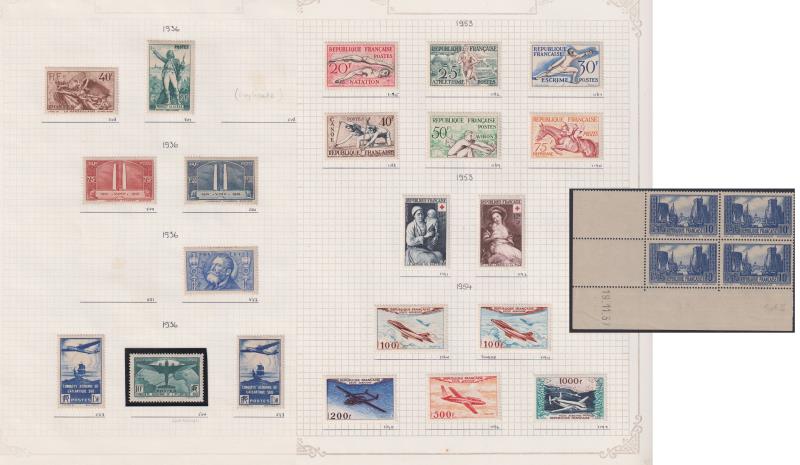 59 M* imageFrance 1876-1960 mint colln on pages, incl 1936 10F Airmail (SG 554, £500) & 1954 Airs set (£520+). Also, 1935-76 mint/MUH seln of corner dates as blocks of 4/pairs, incl 10F Port de la Rochelle (18.11.37) as block of 4 MUH (cat €850), & 24 French Coloni (Image)