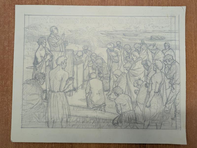 641 image1964 2½d Christmas original artist's pencil drawing, marking 150th anniversary of 1st Christian service in NZ. Unsigned, but by Leonard C Mitchell. Sketched denomination appears to be "2", rather than 2½d as issued. On artist's heavy board, 28 x 25cm. (Image)