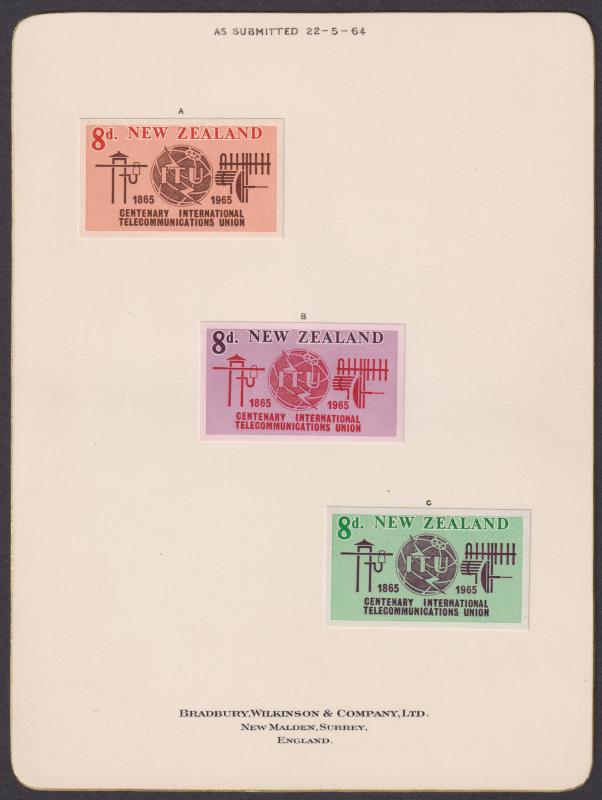 643 P image1965 ITU 3 diff coloured (orange, mauve & green background colours of 8d denomination) Bradbury Wilkinson proofs on cream card (11.3 x 15.2cm) annotated "AS SUBMITTED 22-4-64". (Image)