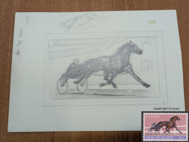 645 image1970 10c Cardigan Bay (champion racehorse) original artist's pencil drawing. Unsigned, but by Leonard C Mitchell. Close to the actual issued design, apart from the positioning of the text. On artist's heavy board, 35 x 25cm. Terrific interpretation. (Image)