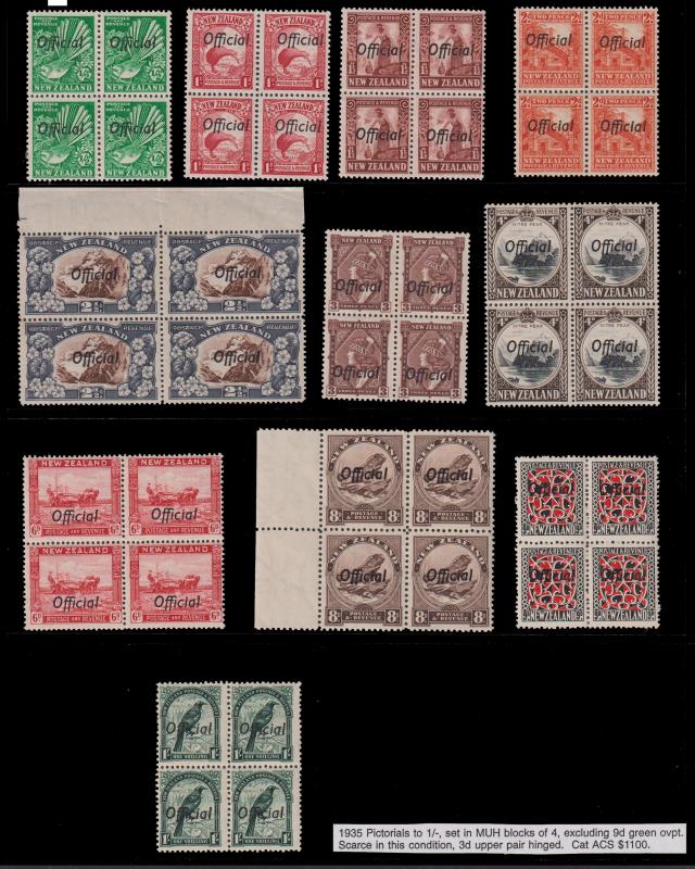 1935 Pictorials short set of 11 to 1/- (no 9d green ovpt) in blocks of 4. Jury cat $1560. MUH (3d upper pair hinged with