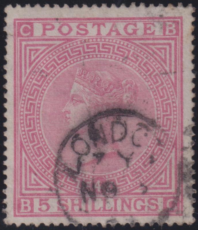 1882 5/- rose (plate 4), uncoloured letters, blued paper, anchor wmk. SG 130. Cat £2500. GU/FU. (Image)