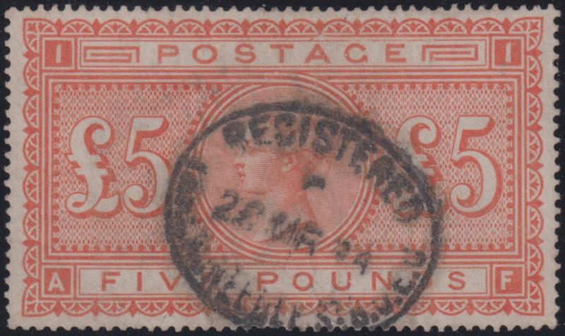 1882 £5 orange (AF), white paper, oval REGISTERED / 23 MR 94 / THREADNEEDLE ST B.O. E.C. cancel. SG 137. Cat £3370. GU