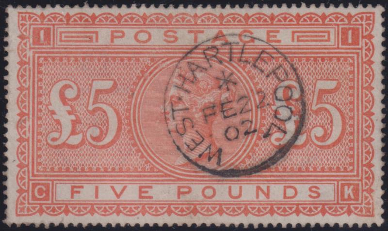 1882 £5 orange, white paper, fine "West Hartlepool FE 22 02" cds. SG 137. Cat £3750. FU. (Image)
