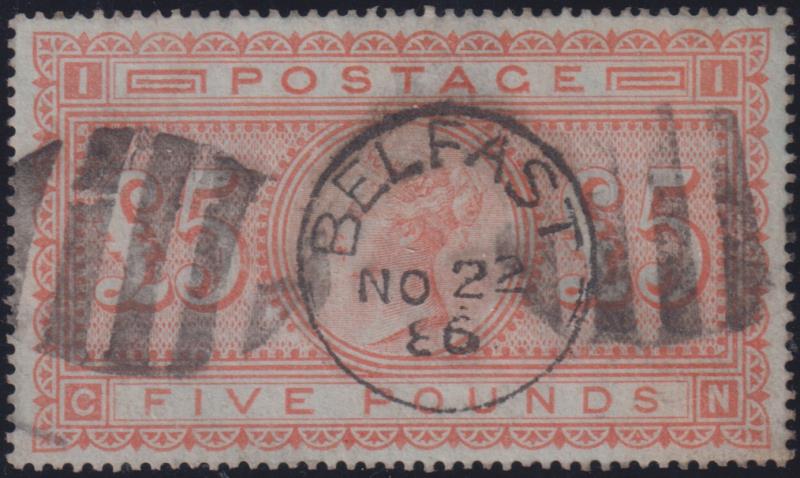 1882 £5 orange on blued paper, Belfast NO 22 86 cds & 2 barred cancels. SG 133. Cat £9000. GU/FU. (Image)