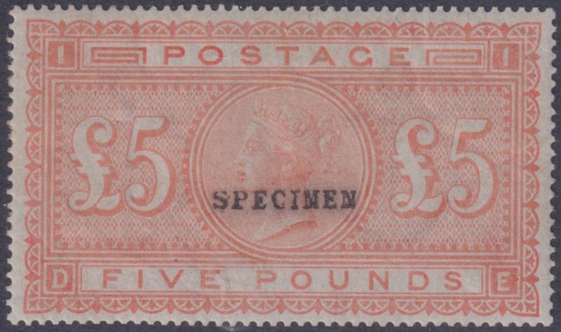 1882 £5 orange on blued paper, "SPECIMEN" ovpt (SG type 9), OG. SG Spec J128s. Cat £3000. (Image)