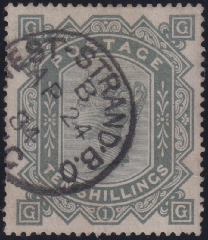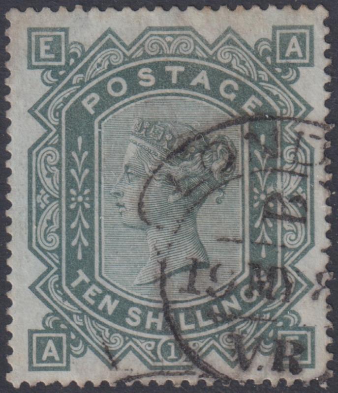 1883 10/- greenish-grey, white paper, anchor wmk. Light ironed out vertical crease. Fine West Strand AP 22 84 cds. SG 135.