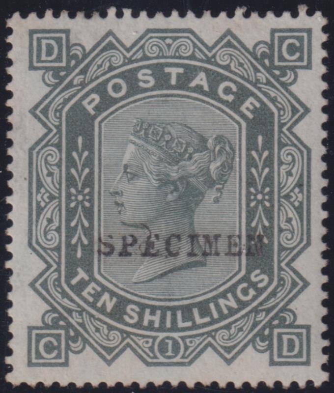 1883 10/- grey-green on blued paper, "SPECIMEN" ovpt (SG type 9), anchor wmk. SG Spec J125t. Cat £8500. (Image)