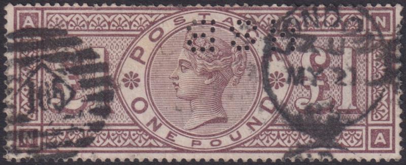 1884 £1 brown-lilac, perfinned, crowns wmk, pmks clear of face. SG 185. Cat £2750. GU/FU. (Image)