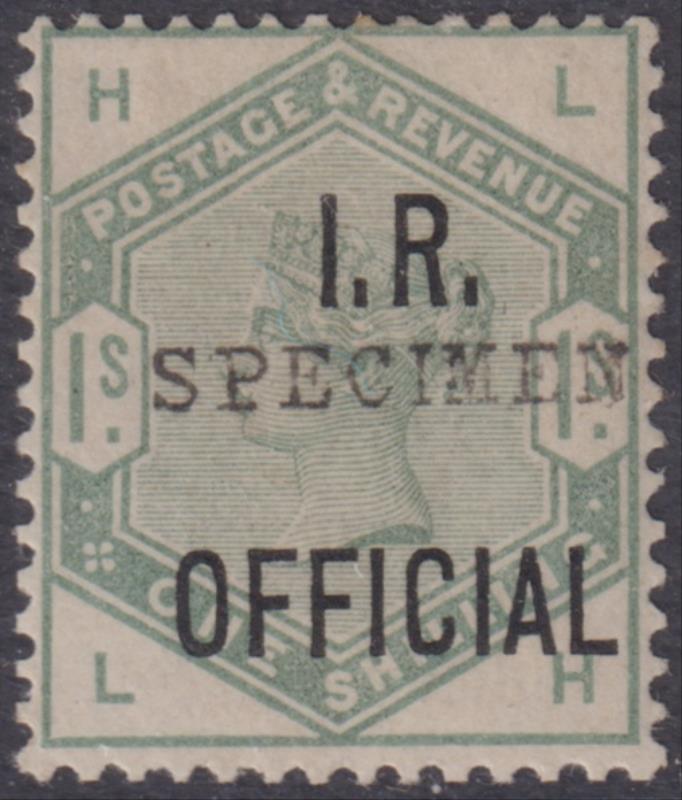 1885 1/- dull green, "I.R. OFFICIAL" & "SPECIMEN" ovpts. SG Spec L6s. Cat £1250. Gum slightly darkened. (Image)
