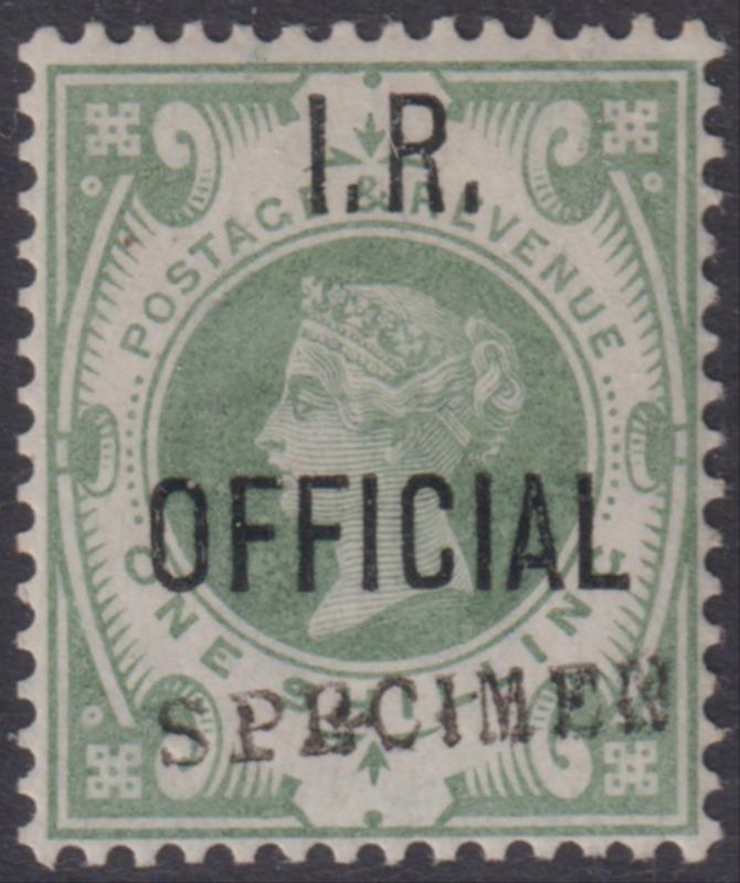 1889 1/- dull green, "I.R. OFFICIAL" & "SPECIMEN" ovpts (serif letters SG type 9). SG Spec L16s. Cat £260. OG. (Image)