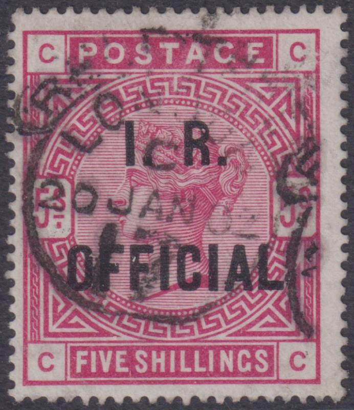 1890 5/- rose, white paper, "I.R. OFFICIAL" ovpt, 5mm closed tear at right, London registered 20 JA 02 pmk. SG O9. Cat £2500.