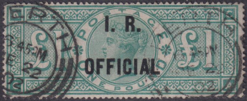 1892 £1 green, "I.R. OFFICIAL" ovpt, Perth FE 22 02 cdss. SG O16. Cat £2250. FU. (Image)