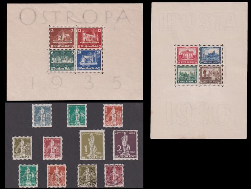82 / imageGermany 1930-49 selected items: 1930 International Philatelic Exbn m/s MUH with minor toning cat £700; 1935 International Philatelic Exbn m/s mint (cv £1,300); 1949 West Berlin UPU set of 7 mint & part set 16pf to 60pf (4v) FU. Total cat £3496. (Image)
