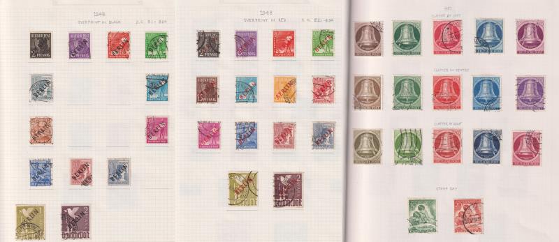90 U imageGermany-West Berlin 1948-90 FU colln of 793v & 2 m/s on pages with 13 diff black BERLIN ovpts (incl 1Mk & 2Mk); & complete set (14v) of red BERLIN ovpts, all three sets of Freedom Bells, & most of the early commems. Minor dupn. Attractive. Cat £3200+. (Image)