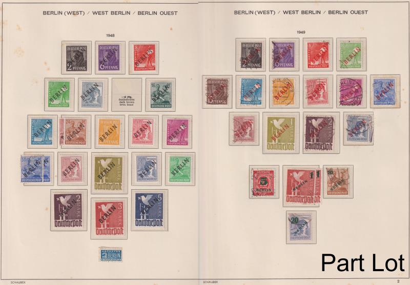 91 / imageGermany-West Berlin 1948-90 colln in Schaubek hingeless album - mix mint and/or used. Noted mint: 1948 black ovpt set (no 15pf); 1949 1M red ovpt; 1949 1M on 3M; 1949 UPU set (minor tone spots); 1949 Relief Fund set; Relief Fund m/s (MUH); many early com (Image)