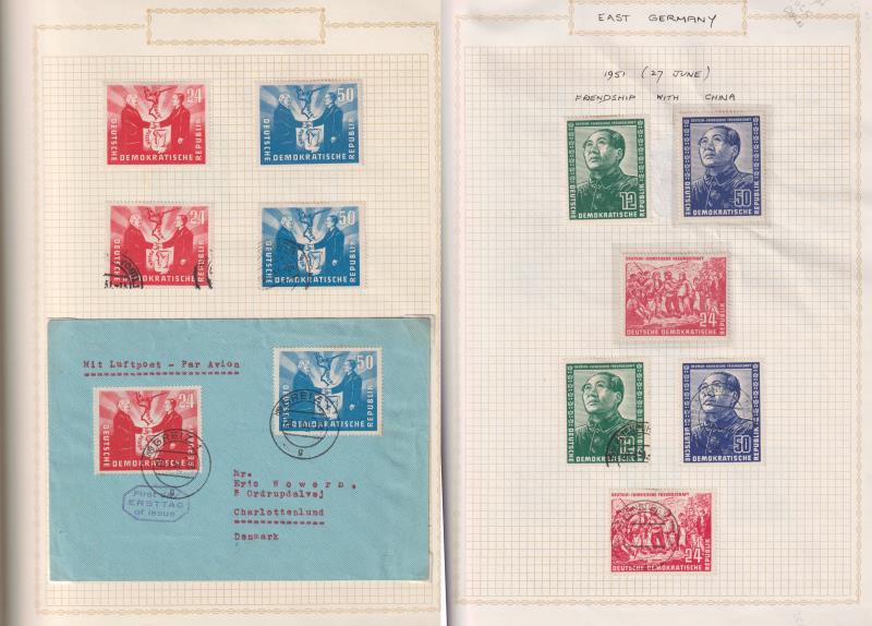 93 / imageGermany-East 1949-76 comprehensive colln of mint, used & FDCs (many PU to NZ) on pages. Noted some scarce earlier items, eg: 1950 Debria Exbn m/s SG E29a cat £225 (on FDC to NZ), 1951 China Friendship set SG E43-45 mint (50pf paper adhesions) & FU (cat £ (Image)