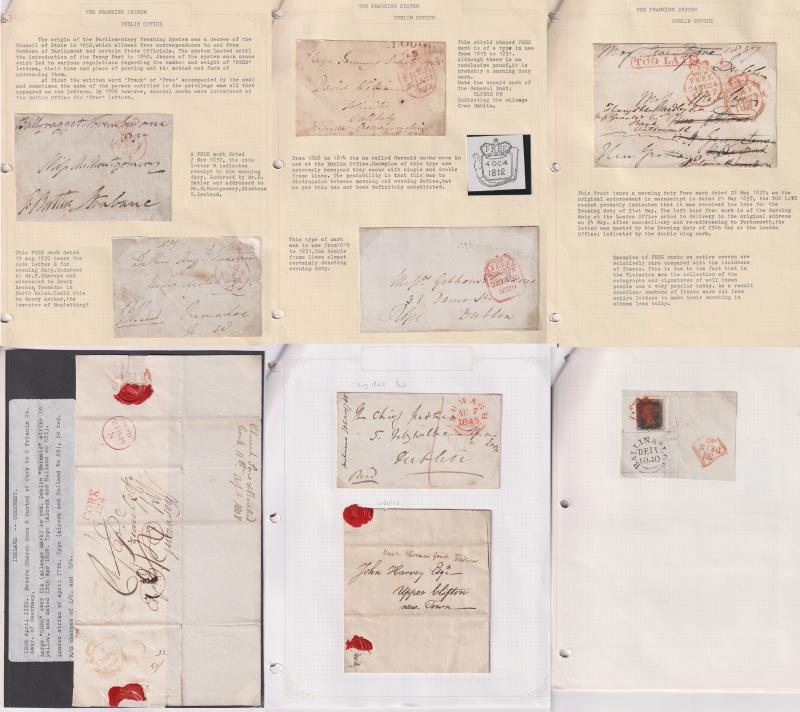 104 CU imageIreland 1808-c1880s Postal History colln on pages with annotation. Incl 6 stampless items (5 "free" fronts, 2 x entires one 1808 Cork to Guernsey, 1845 envelope); 1d Black (pl 5, NL) on piece; 5 GB QV on covers; 29 mostly 1d Reds various Irish pmks. (Image)