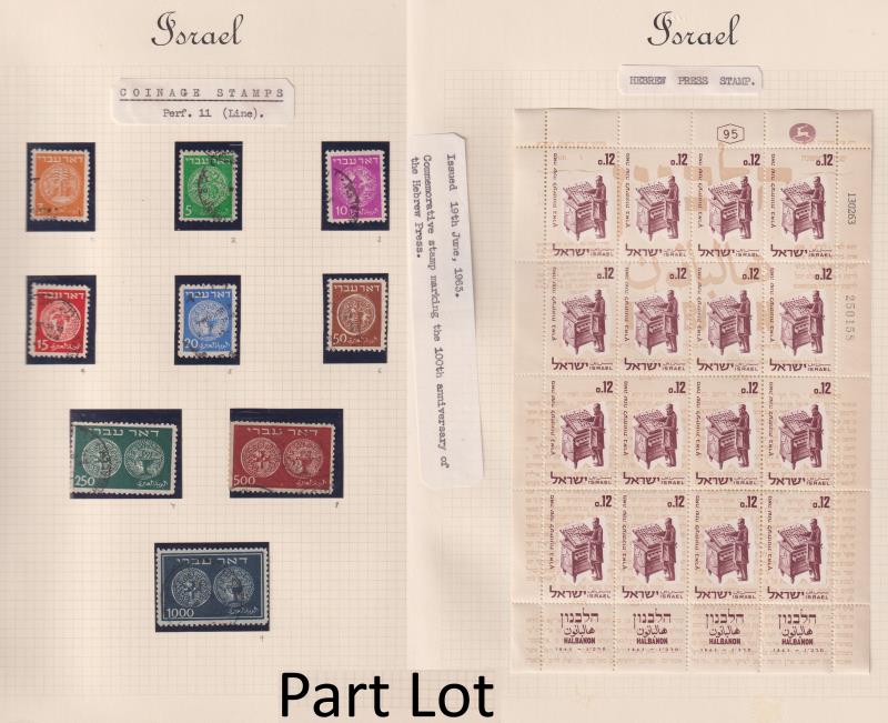 106 / imageIsrael 1948-64 comprehensive mint & used colln in mounts in 3 SG Plymouth albums. Noted 1948 Coinage set of 9 FU & set on FDC, 1949 TABUL m/s mint, 1960 TAVIV m/s x 5 (MUH x 2, mint x 1 & CTO x 2) & 1963 Hebrew Press Centenary sheet of 16 mint. Weight 7 (Image)